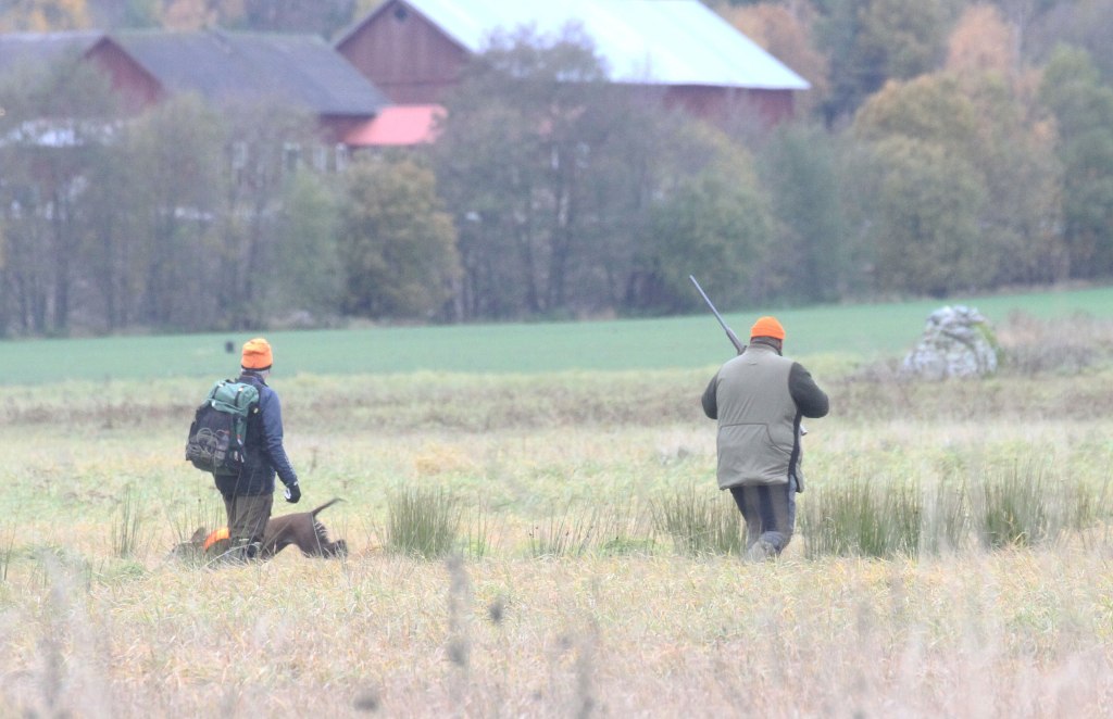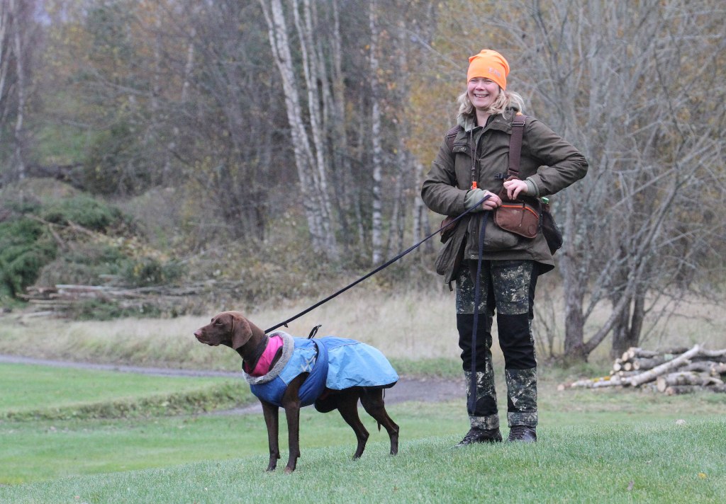 Elsa började dagen med att direkt gå mot ett dike där hon per omgående fattade stånd för en fasan som tyvärr löpte undan, något hon inte hade någon vana vid så det utvecklades till en stöt men därefter hade hon fattat galoppen och fick tre godkända fågeltagningar där hon står, reser och är helt lugn när fågeln kommer upp. Men hon fattade även en annan sak, det var att fåglarna satt ju inte ute på någon stübb utan skulle man hitta fågel så var det i kantzonerna, jakthund som man är och Kenth hade liksom inga riktiga styrmedel när Elsa helt tog över huvudrollen som egen tänkande jakthund. Punkt på det liksom. Hursom lite trist blev det då det drog ner hennes fältbetyg, då stil gick före viltfinnarförmåga, ingen annan hund hittade lika mycket fågel som Elsa nu gjorde. Det blev tillslut en 5a på fält och en 6a på apporten då hon först inte tänkte hämta någon kastapport utan ville jaga vidare så Kenth var tvungen att säga nej till henne och två pinnar rök, dessutom tappade Kenth apporten och det fick Elsa för, att hon droppat. Men hon visade vilken sjutusan till hund hon är och har nu ett andra pris i ökl.